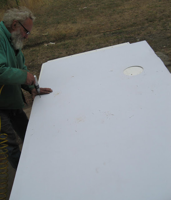 While I'm getting my Punch List ready, Chef Renauld is putting together the bedframe which doubles as a computer table, dining table and couch during the day. He's setting the self-closing concealed hinges (three per leaflet) with 1/8" metal support bars so that it won't rattle or vibrate apart after one-quarter million miles.