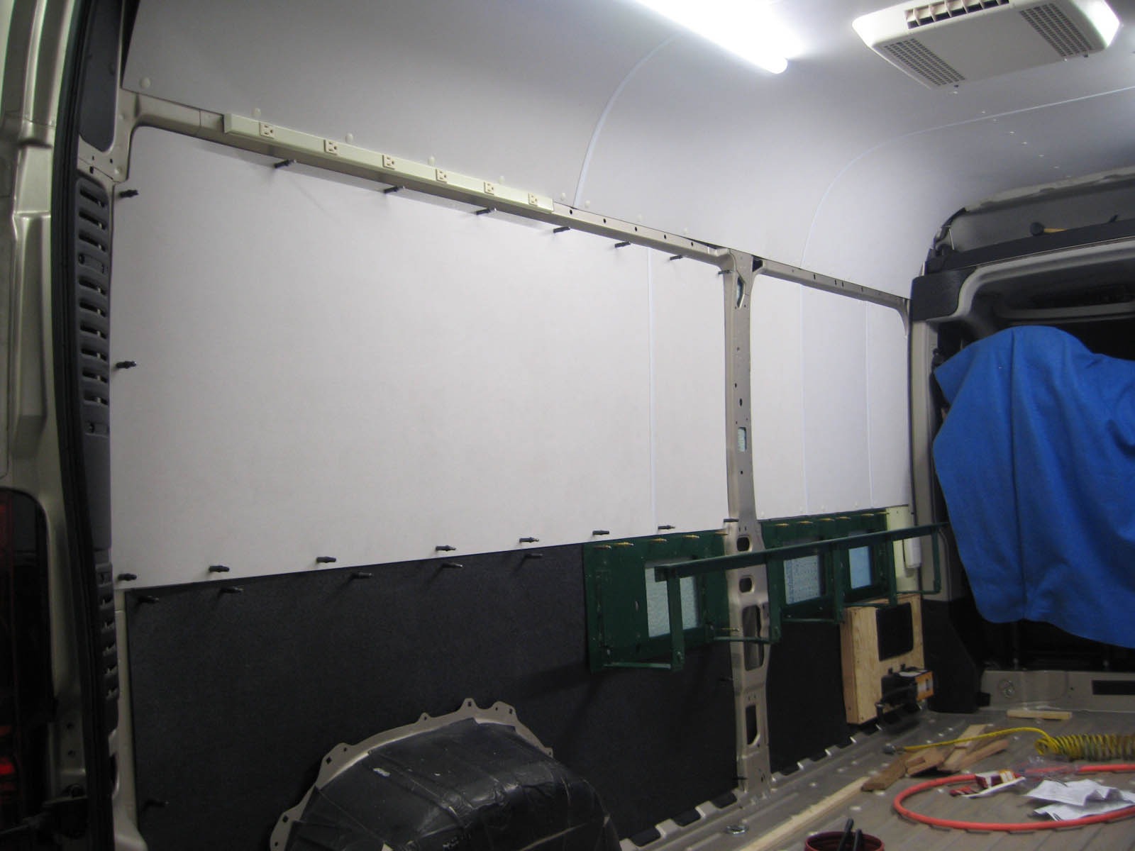 it black. Tomorrow one more light coat and while the paint dries for a few days, we'll re-connect the AC unit, install and wire two fluorescent ceiling lights and install a 120-outlet behind the driver's seat.